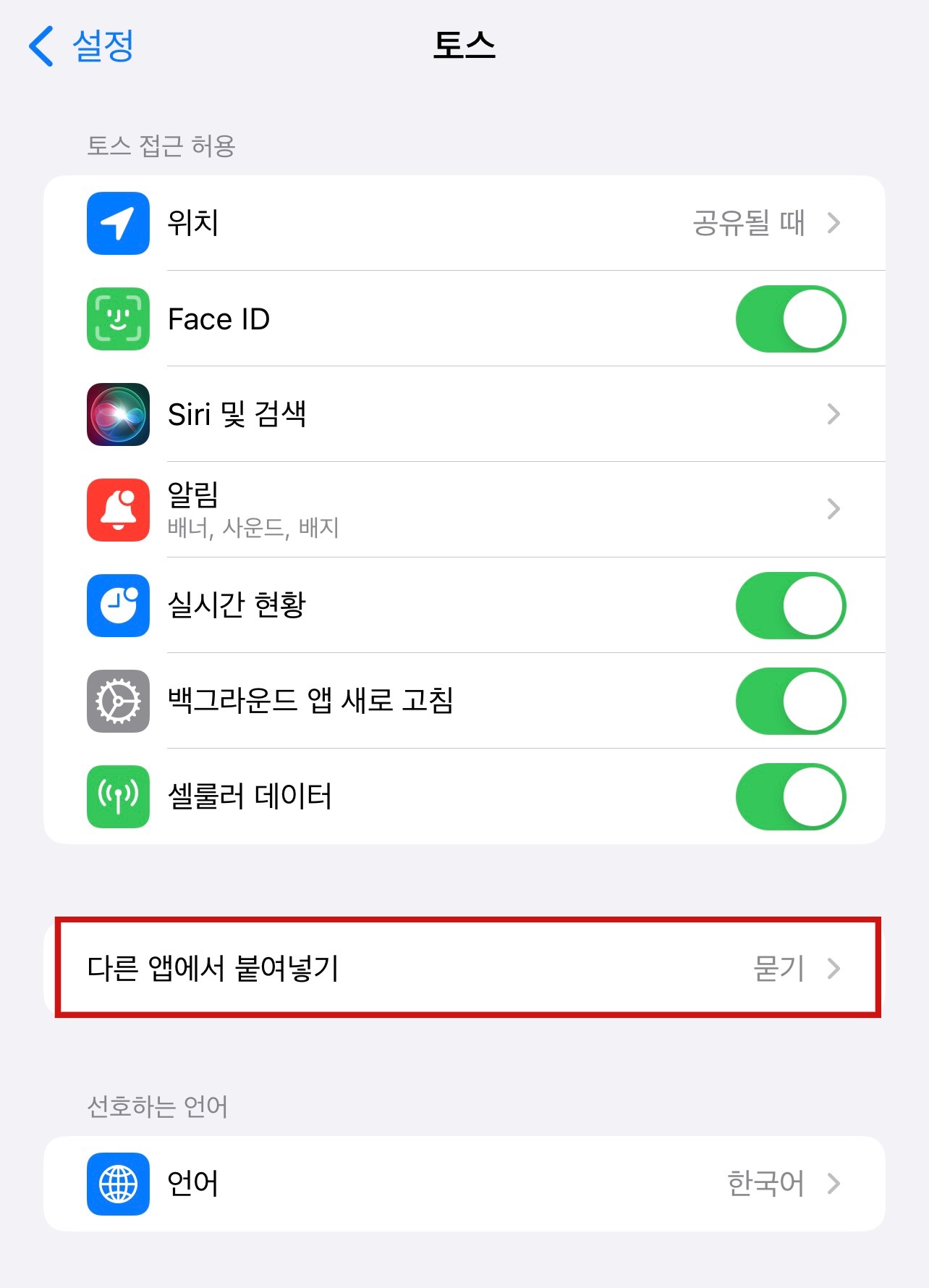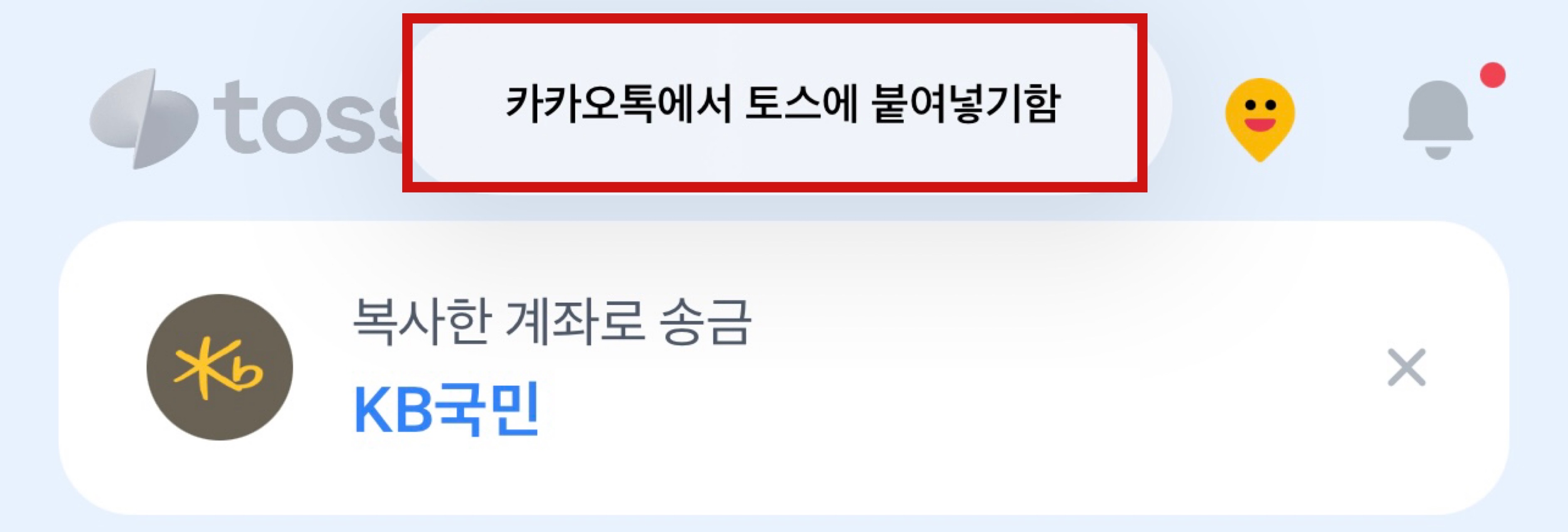 허용으로 변경한 후 다시 계좌번호를 복사하여 토스앱을 실행해봤습니다. 붙여넣기 허용 창은 더이상 뜨지 않고 이렇게 붙여넣기했다고 뜨네요. 훨씬 편해졌습니다!