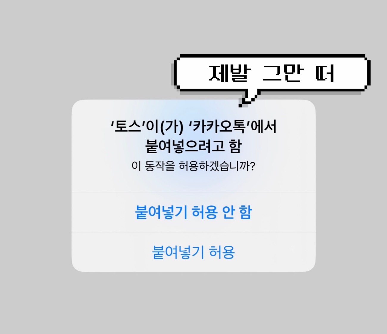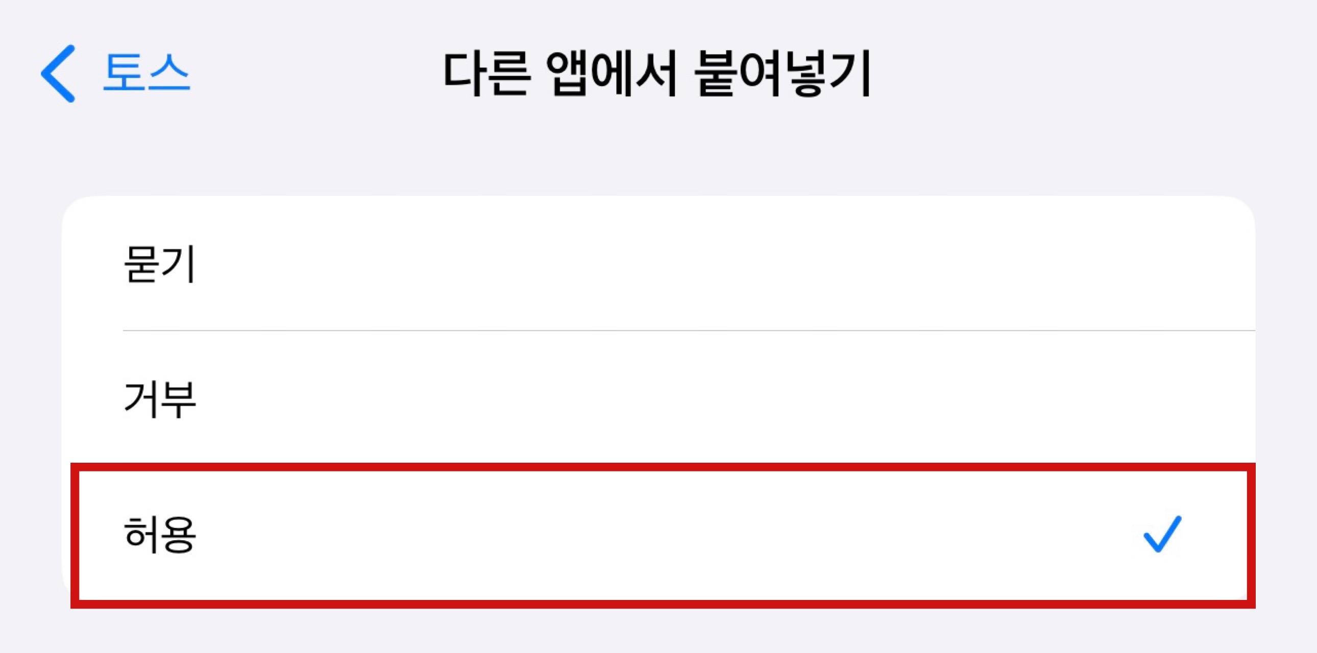 다른 앱에서 붙여넣기를 누르면 이 화면이 나옵니다. 여기서 허용을 눌러줍니다. 만약 붙여넣기 허용을 안하시려면 거부를 눌러주시면 됩니다.